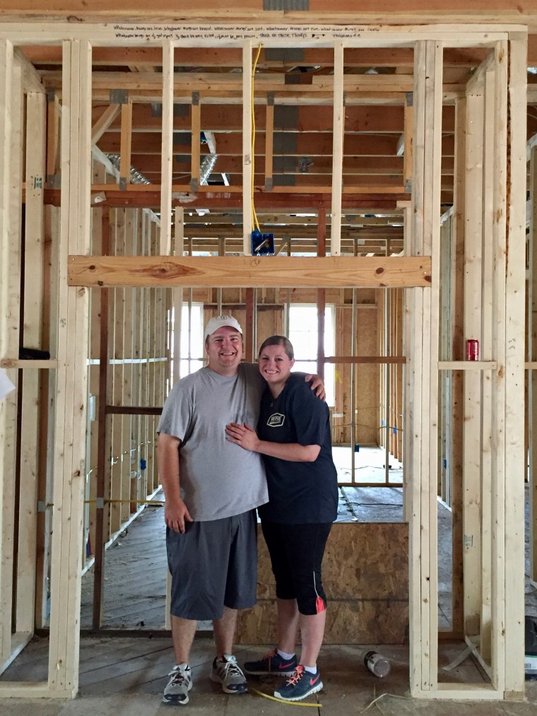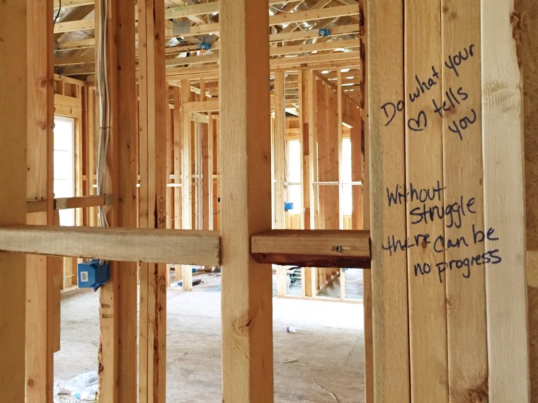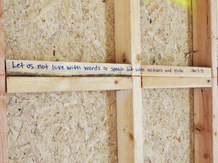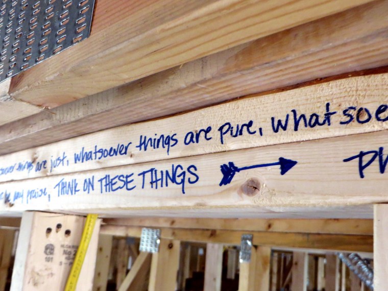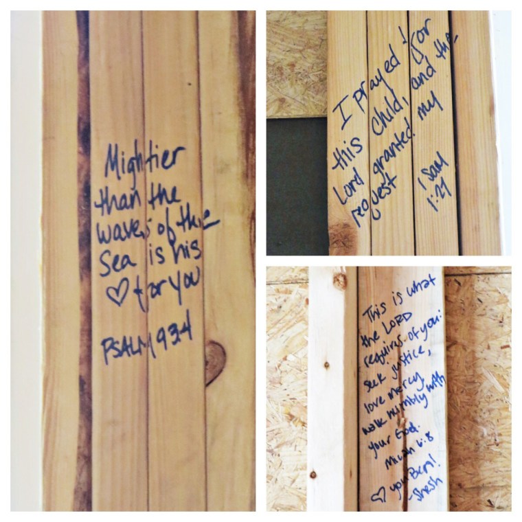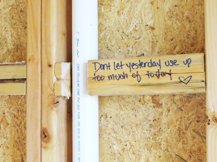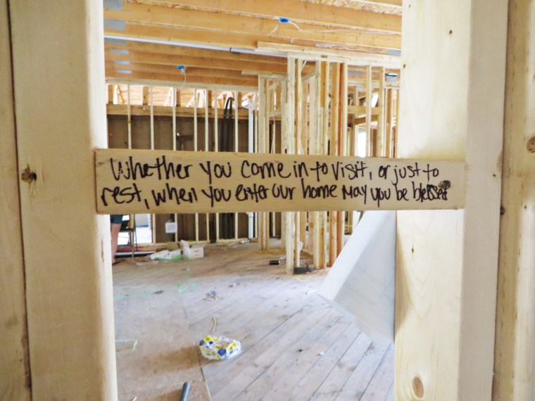 So, in an effort to find the joy, I decided that the GREAT thing about having so many exposed walls around is that we had a unique opportunity to fill our home with verses and messages that represented our family and will surround us as long as we’re living there. Like a time capsule… except maybe not as exciting?